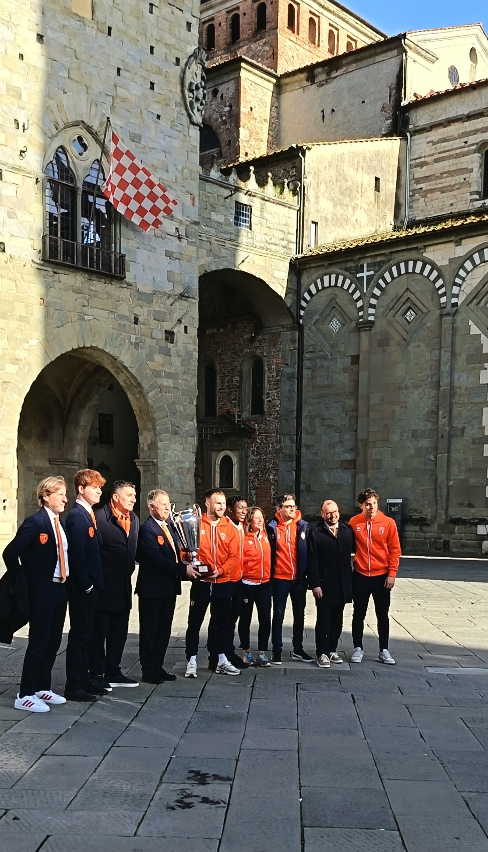 I massimi onori per la Coppa Italia conquistata sabato scorso ad Ancona. Oggi pomeriggio la Coppa ha preso la via per Piazza del Duomo e poi è salita al primo piano dell'antico Palazzo Comunale. A ricevere la delegazione della Pistoiese, capitanata dall'Amministratore Delegato Fabio Fondatori e dal main sponsor Vannino Vannucci, con una rappresentanza di calciatori, Russo, Cuomo e Sangarè, c'era la sindaca Annamaria Celesti e l'assessore allo Sport Alessandro Sabella. In Sala Maggiore sono state scattate le foto di rito con bene in vista la prestigiosa coppa, poi c'è stato il passaggio in Sala Grandonio, dove si sarebbe svolto, essendo lunedì, il consueto Consiglio Comunale. Presenti tutti gli schieramenti politici, a prendere la parola è stata Annamaria Celesti, presente fra l'altro al Del Conero, che si è detta orgogliosa della conquista di questo titolo che ha portato all'attenzione dell'Italia tutta la città di Pistoia. Fabio Fondatori ha ringraziato vivamente l'amministrazione per la vicinanza alle cose arancioni, con particolare riferimento agli accordi presi per la gestione di Pistoia Ovest. L'Amministratore Delegato ha sottolineato la bontà di questa gestione Iorio: "E' soltanto un anno e mezzo che questa socieà è operativa e già vediamo i risultati. Da tanti anni non c'era un progetto e il Presidente Iorio, con il suo entusiamo, ha ricreato un qualcosa che guarda al futuro." Anche Vannino Vannucci, entusiasta più che mai ha evidenziato come ora si possa guardare con fiducia ad un futuro ricco di successi: "Abbiamo un Presidente che oltre ad averci messo tanti soldi è carico di entusiasmo. La città deve solo seguirlo." Sono seguiti, poi, gli interventi di esponenti della maggioranza e della minoranza e da entrambi gli schieramenti ci sono state parole di soddisfazione per i risultati raggiunti e per il nuovo entusiasmo che c'è in città.